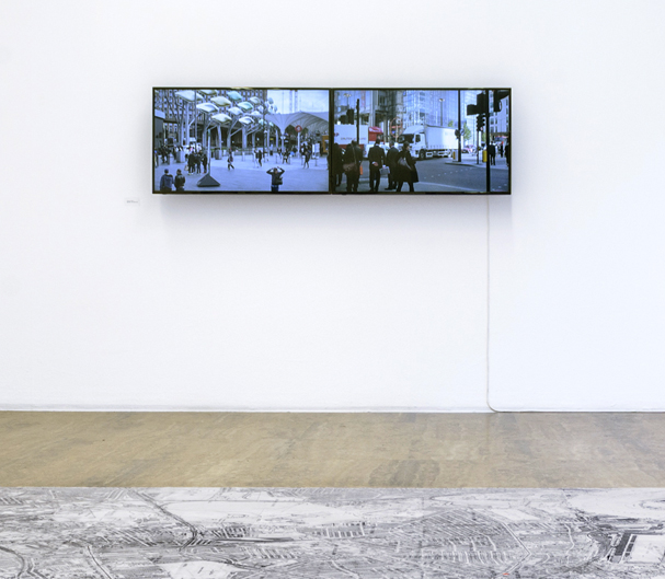 Un bâtiment en verre déjà présent sur les photographies réapparaît dans le dyptique vidéo de City Scape diffusé sur des moniteurs accrochés au mur. Sur l’écran de gauche, du mobilier urbain décoratif attire l’attention. Un panoramique saisit la place, puis reproduit le même mouvement par un balayage optique plus rapproché. Ce mouvement entre en tension avec le plan fixe de l’autre écran, bien qu’il soit animé par une circulation urbaine intense. Cette activité économique a pour contrepoint la bande son d’une manifestation et les slogans qui rendent compte des problèmes du monde du travail.