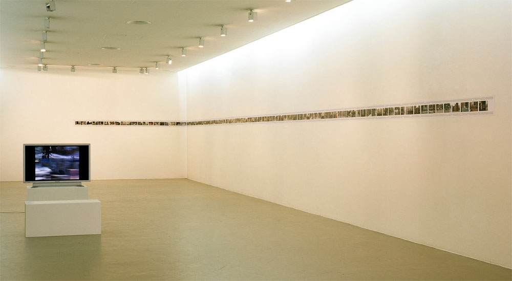 Installation, photographies avec texte, 110 images de 10.4/14.8cm collées sur papier. Dimensions variables. Longueur max. 21/1700cm. Forum d'art contemporain, Sierre (photographie Jean-Marc Meunier)