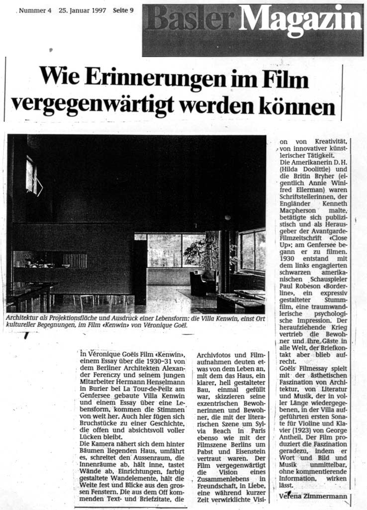 Die Villa KENWIN, 1930-1931 in La Tour-de-Peilz am Genfersee von Hermann Henselmann (dem zukünfigen Stadtarchitekten von Ostberlin), im Auftrag von KENneth Macpherson und WINifred Ellerman (Bryher) erbaut, ist das Symbol einer Utopie des Modernismus: Erschaffung ex nihilo, Fremdkörper in einer Umgebung, die sie zurückweist, offener Ort. Die Villa wurde entworfen als Schauplatz neuer, schöpferischer und zwischenmenschlicher Beziehungen. Bryher und Macpherson, beides Engländer, sie Schriftstellerin, er Filmemacher, verbrachten dort einige Jahre mit ihrer gemeinsamen Freundin, der amerikanischen Lyrikerin H.D. (Hilda Doolittle-Aldington) und deren Tochter Perdita. Danach trennten sich ihre Wege, lediglich Bryher lebte bis zu ihrem Tod im Jahre 1983 in der Villa KENWIN. 1987 wurde die Villa vom Architekten Giovanni Pezzoli gekauft und vollständig restauriert. Archivmaterial und heutige Bilder der Villa, veranschaulichen, in einer subjektiven Annäherung, einige Aspekte dieser Geschichte. Lire plus / Read more (1) (2) (3)