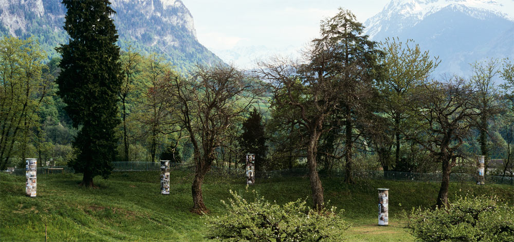 5 colonnes Morris sont disposées dans le parc, comme elles le seraient le long d'un boulevard. Ces éléments recouverts habituellement de publicités et d'affiches sont ici utilisés dans une optique différente. Ils servent en effet à mettre en évidence, dans un environnement naturel, ce que nous ne percevons plus dans l'environnement urbain, tels que les nettoyeurs des rues ou la police omniprésente. Les photographies prises lors d'un séjour de plusieurs mois à Barcelone, illustrent 5 thématiques spécifiques. Utilisant l'aspect attractif, monumental de ces colonnes, l'artiste nous place non pas face à un espace d'information, mais face à un espace de réflexion |