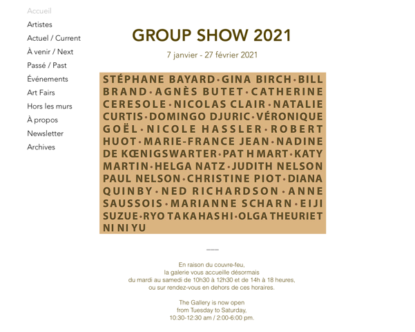 2024 1-7 juin: SOLILOQUE 2, LA BARBARIE, séminaire cinéma et poésie, Almaty, Kazakhstan 5 avril: Allegro, École supérieure d'art et design de Saint-Étienne 25-28 janvier: SQUARE, Art Genève, DDA 2023 25-29 janvier: LANDSCAPE ONE, Art Genève 26-27 janvier: SOLILOQUE 2, LA BARBARIE, vidéodrome, Marseille 2022 15 septembre - 22 octobre SQUARE, Galerie Arnaud Lefebvre, Paris 21 juin au 15 juillet: LANDSCAPE ONE, Art Truck #003, Fmac, Genève 2021 2 septembre - 30 octobre: exposition de groupe et soirée individuelle, Galerie Arnaud Lefèbvre, Paris 7 janvier - 27 février: Group Show, Galerie Arnaud Lefèbvre, Paris Janvier: SQUARE, Mire, gare du Léman Express, Bachet 2020 Dès fin août: SQUARE, Mire, gare du Léman Express, Lancy Pont-Rouge2-13 juin: AD NAUSEAM, Galerie Arnaud Lefèbvre, Paris 29 janvier - 02 février: CITY SCAPE, Artgenève, Fmac, Palexpo 2019 12 - 20 octobre: NO ROOM TO MOVE, Bienvenue, Cité Internatiponale des Arts, Paris 20 juin: POBLE NO, Galerie Arnaud Lefèbvre, Paris 20 juin - 13 juillet: aperçu d'une oeuvre, Galerie Arnaud Lefebvre, Paris 4 avril: HANS SCHMIDT ARCHITECTE, Kommunales Kino, Weimar 31 janvier - 23 février: PERTINENCE ET IMPERTINENCE, la façade du monde, Hachimonjiya, Kyoto