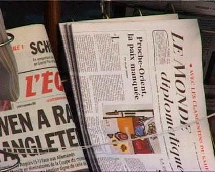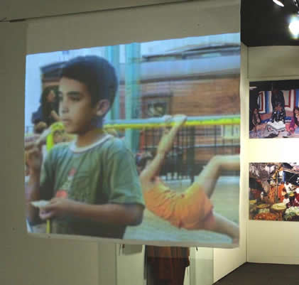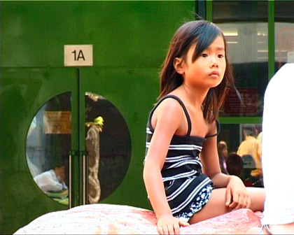 Installation. DVD. Video, boucle 4min.15, sans titre ni générique, couleur, muet. Projection en boucle sur tissu flottant transparent (visible des deux côtés). Exposition Paix musée d'éthnographie, Genève
