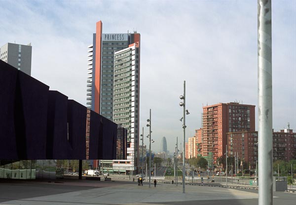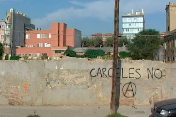 Et ce sont justement ces «transformations physiques» du tissu urbain que retrace Véronique Goël : alternant les travellings latéraux pris depuis une voiture, Poble No sillonne les rues du quartier, découvre des immeubles en décombre, des terrains en friche et d’incessants chantiers, ponctués de-ci de-là par des cheminées d’usine et des bâtiments neufs, oblitérant les vestiges du quartier ouvrier. Parallèlement à cet arpentement d’un espace béant et éventré, la bande-son délivre, par bribes, une série de données factuelles, portant aussi bien sur la fluctuation de la population et des entreprises en activité dans le quartier que sur la réalité économique des travaux entrepris. Le propos se recentre sur les mécanismes de la spéculation immobilière, face à l’ouverture de ce gigantesque marché qui conduit à la délocalisation de la population. La musique (une composition originale pour piano préparé) souligne, par ses sonorités industrielles, la disparition du passé ouvrier de Barcelone, pourtant constitutif de son histoire. Aussi Véronique Goël ne manque-t-elle pas de recourir à des archives photographiques, à des traces renvoyant à une histoire désormais inaccessible, opérant par là un travail de mémoire, si ce n’est de réparation du passé. Ce recours à des documents photographiques, impliquant un figement du plan et une limitation des mouvements de la caméra, inverse le balayage constant du champ qui constitue le principe constructif du film – et réinscrit en continu les propos jusqu’ici égrenés lors des différents plans séquences. Et de fait, après une douzaine de travellings latéraux droite/gauche, la caméra inverse sa trajectoire, découvre un hôtel cinq étoiles, rappelant vaguement les formes d’une construction industrielle, avant de s’immobiliser ; deux plans brefs et fixes suivent, précédant l’exposition d’une dizaine de photographies, la plupart en noir et blanc. Une construction cylindrique, détruite à l’époque des Jeux Olympiques, est présente à deux reprises dans les archives photographiques. Selon le même principe de raccord formel, c’est une photo en couleur, représentant la place du Forum, avec notamment l’édifice de Herzog et de Meuron et la tour Agbar au loin, qui introduit aux derniers travellings: par l’entremise d’un raccord dans l’axe, le film réintègre le régime de l’image en mouvement, en recadrant l’hôtel Princess (une construction d’Oscar Tusquets) au sein de la place du Forum. Les mouvements latéraux de la caméra qui font suite à ce bref plan fixe relancent la trajectoire implacable du film, exhibant dans un mouvement étale les décombres de la ville industrielle, entrecoupée de terrains vagues et masquée par des rangées de panneaux publicitaires. En ce sens, Poble No constitue un radical contrechamp aux monuments signés Nouvel, Herzog et de Meuron, etc.